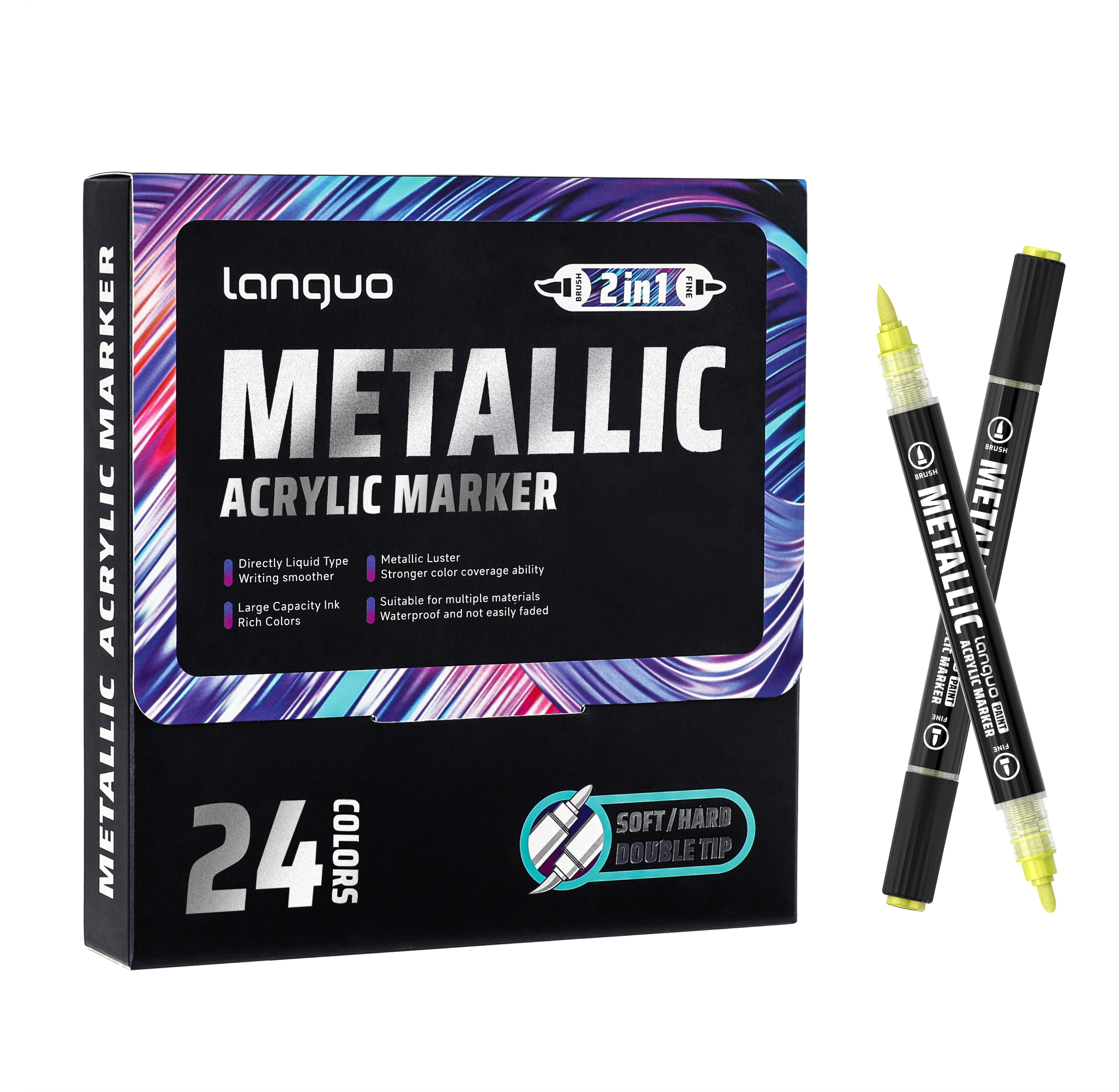 24 Colors Metallic Acrylic Paint Markers, Dual Tip Acrylic Metallic Markers Set (Brush & Fine)