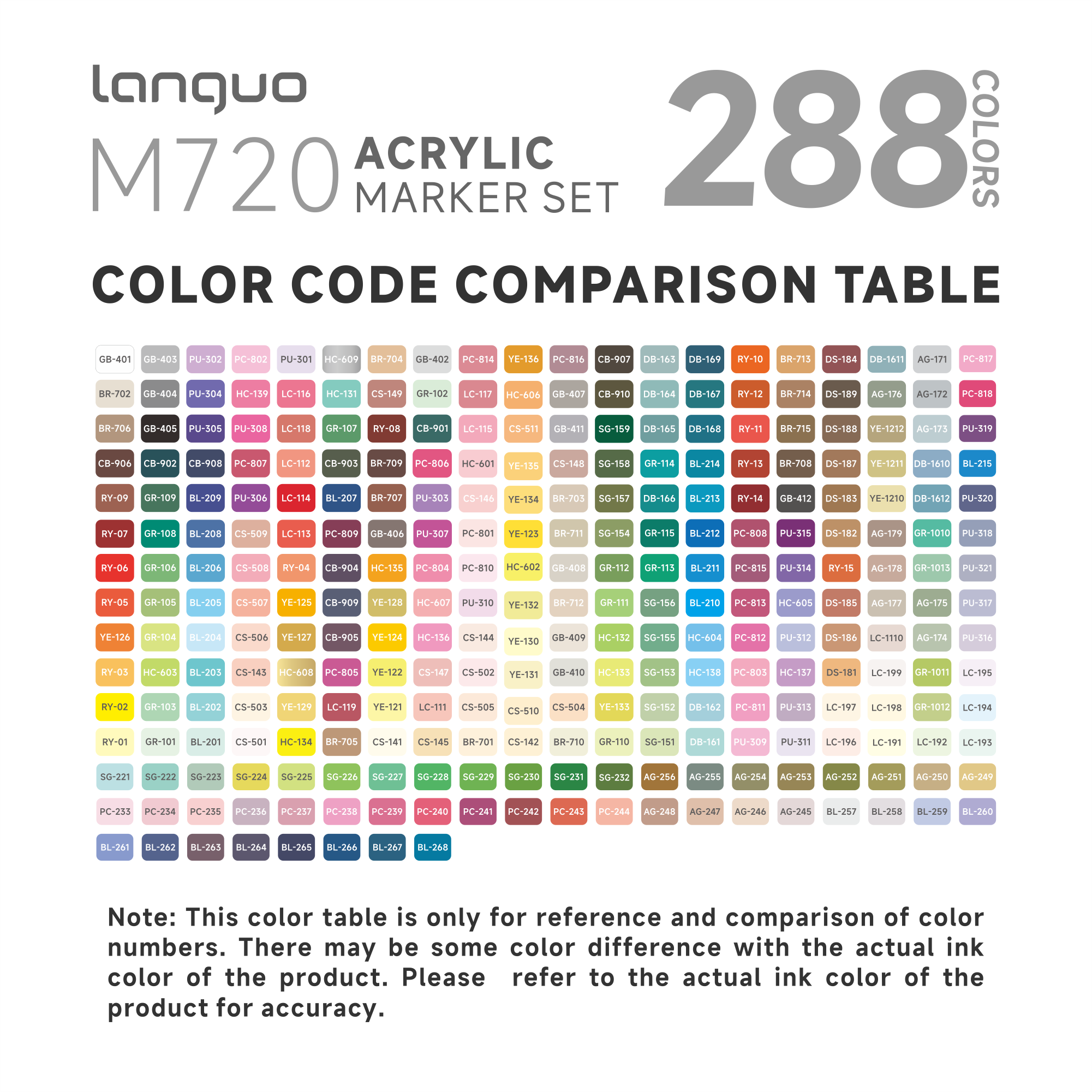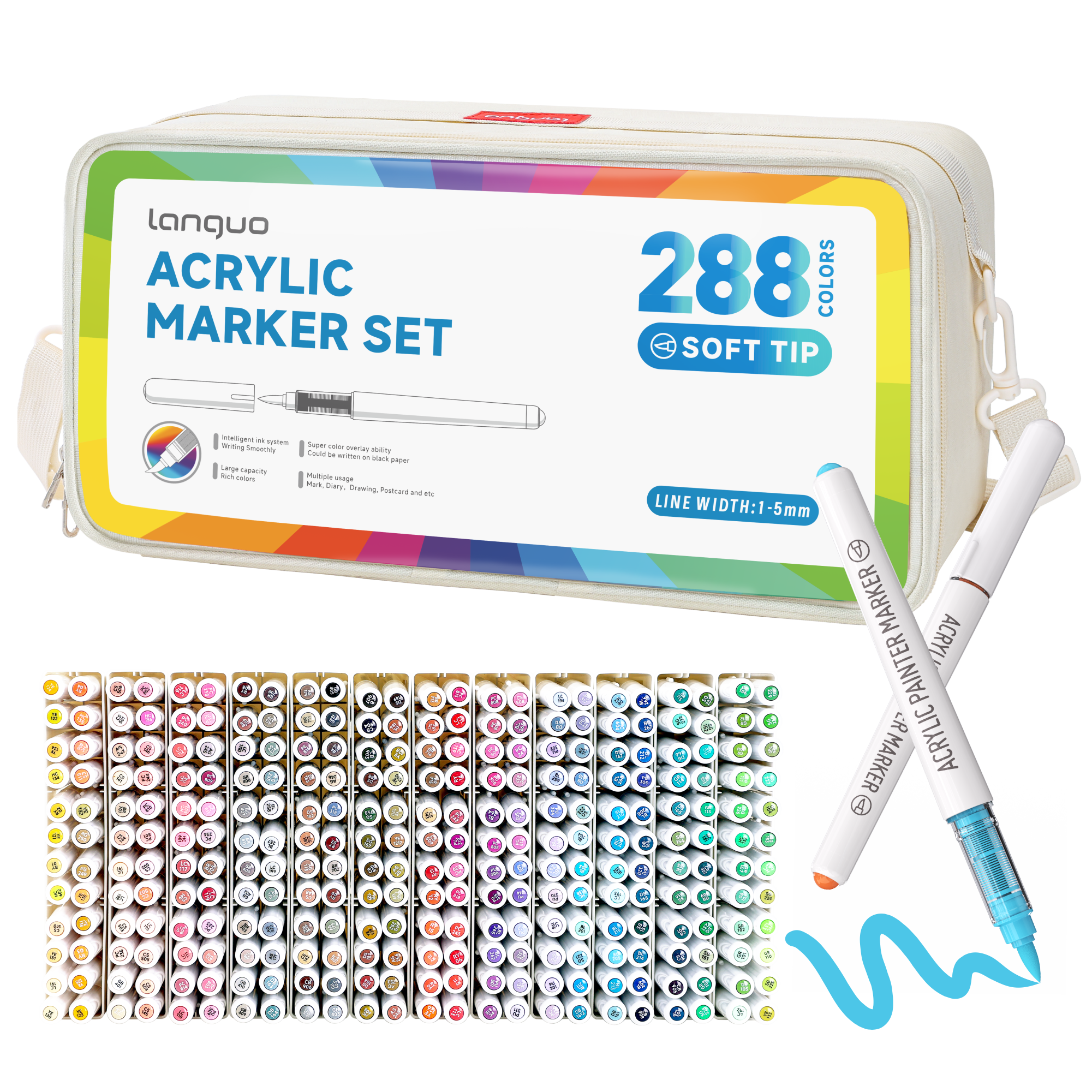 - 288 Colors with Direct Liquid Ink System: Languo acrylic paint markers set uses a direct liquid ink system for steady ink flow and high capacity. Enjoy smooth coloring with rich acrylic on any surface—ideal for creative projects