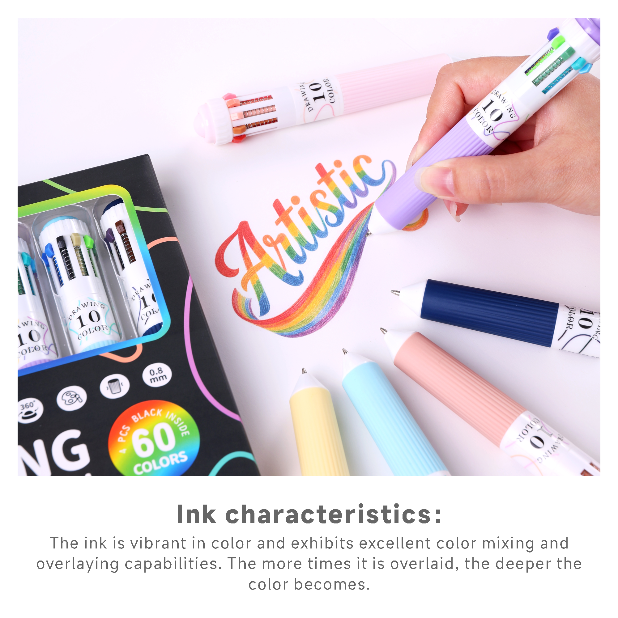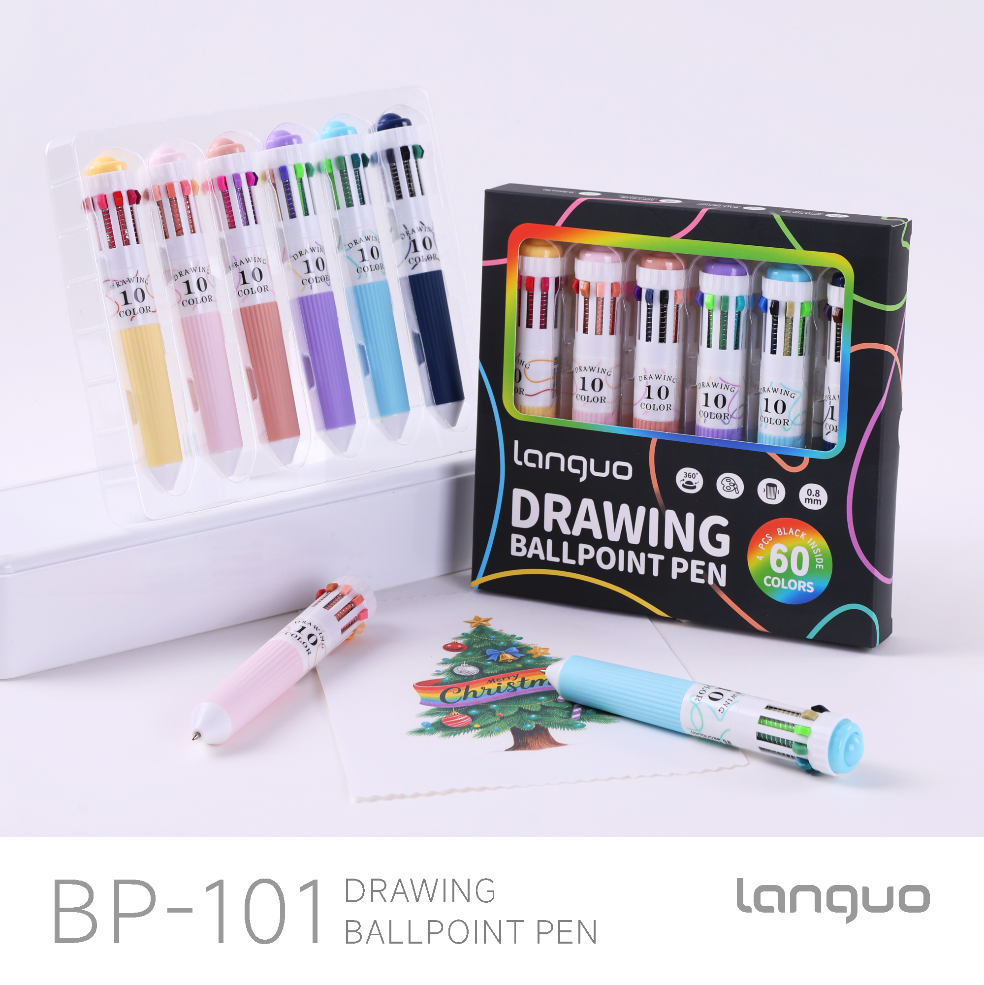 This Languo BP-101 collection includes 6 multicolor pens, each offering 10 vivid ink colors—a total of 60 rich and versatile shades. The set includes: Red-Yellow Series, Monet Series, Skin Tone Series, Candy Colors, Green Series, and Bright Black. The Red-Yellow, Monet, Green, and Bright Black pens each feature one extra black ink, ensuring all your writing, sketching, and coloring needs are covered.Premium 0.8mm Tip for Smooth Writing