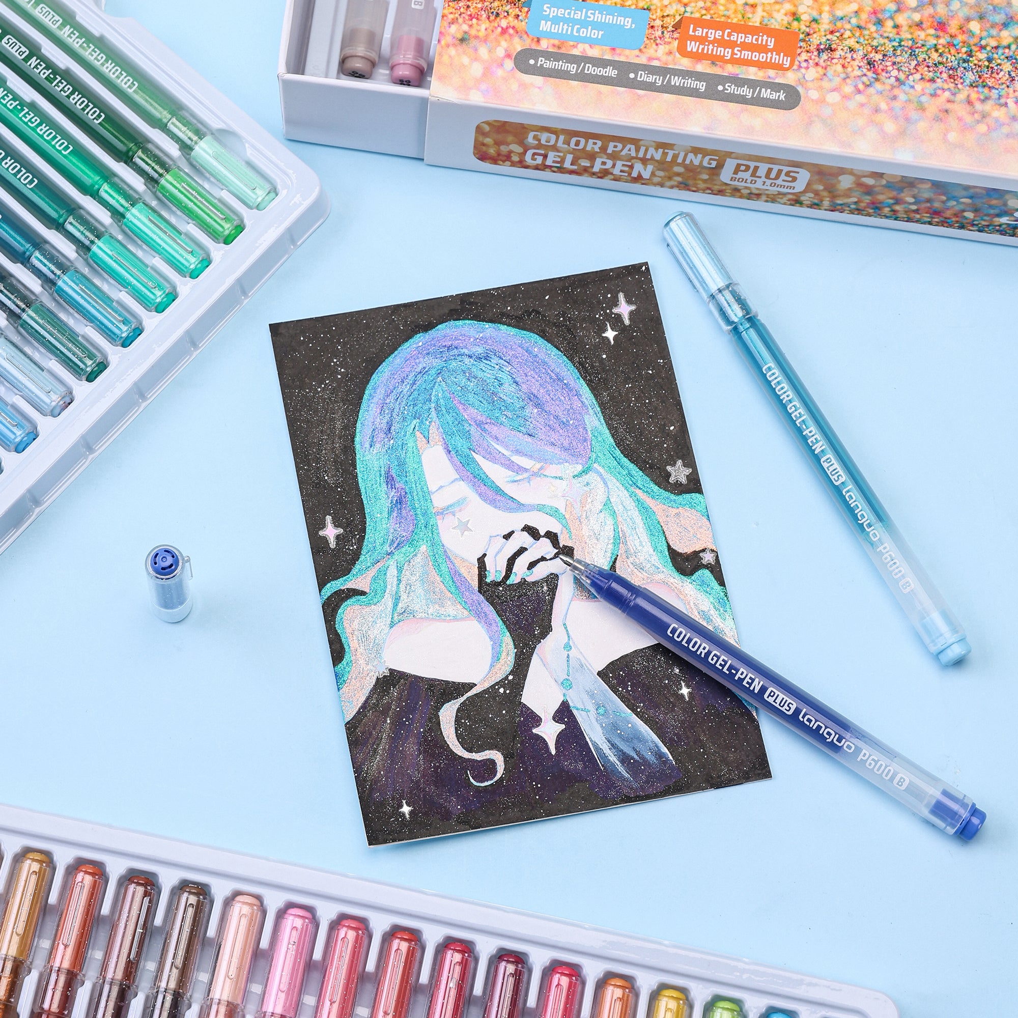 - Special Shining Multi-Color (54-Color Set): This 54-color glitter gel pen set offers a dazzling and diverse range of shimmering hues. Each pen features specially formulated sparkling ink, varying in intensity, creating an extra layer of radiance. Perfect for those who want to add a standout touch to their artwork